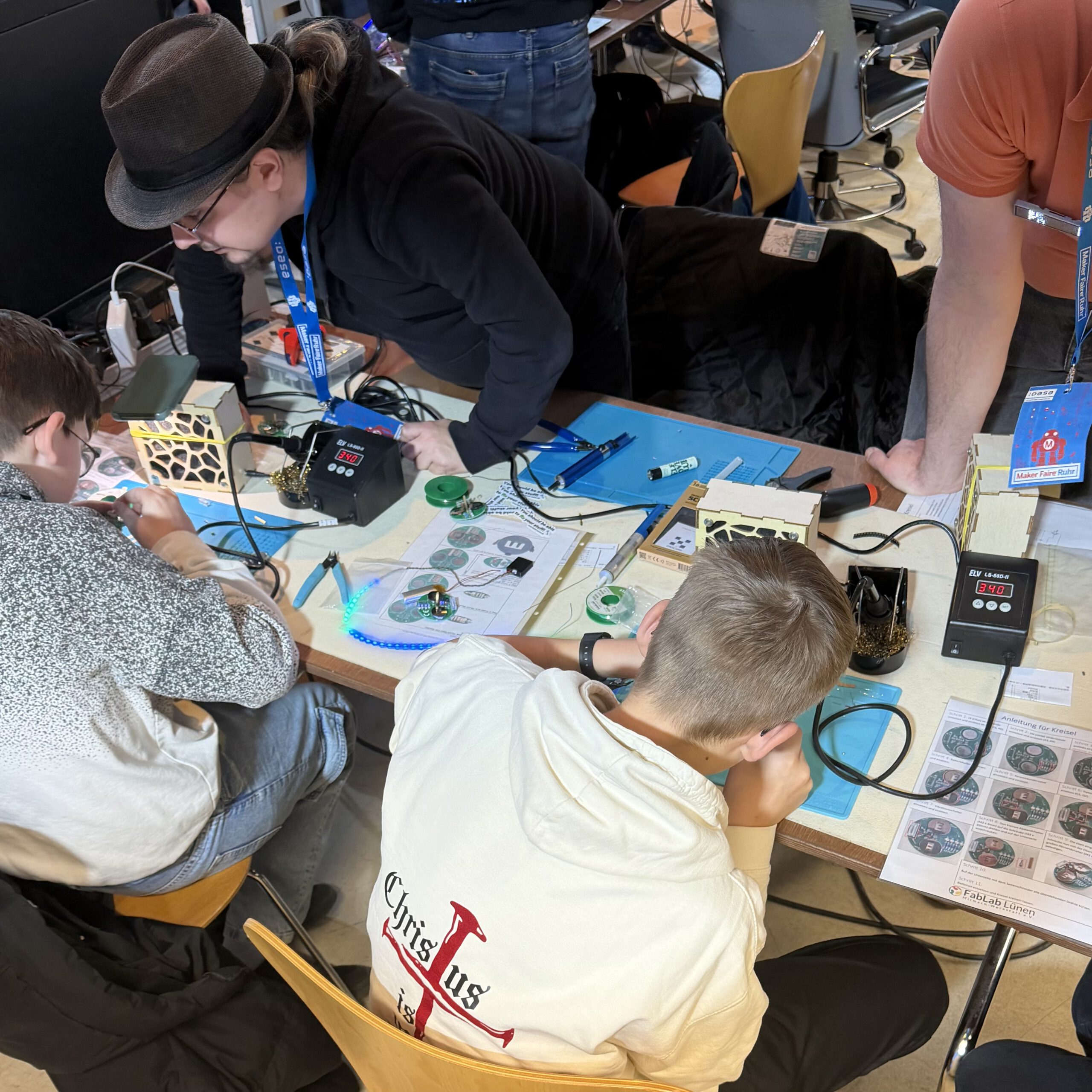 An unserer Lötstation konntet ihr euch euren eigenen leuchtenden Kreisel bauen oder einen unserer smarten Lichtpucks zusammenlöten – natürlich inklusive kleiner Einführung und Unterstützung vor Ort.