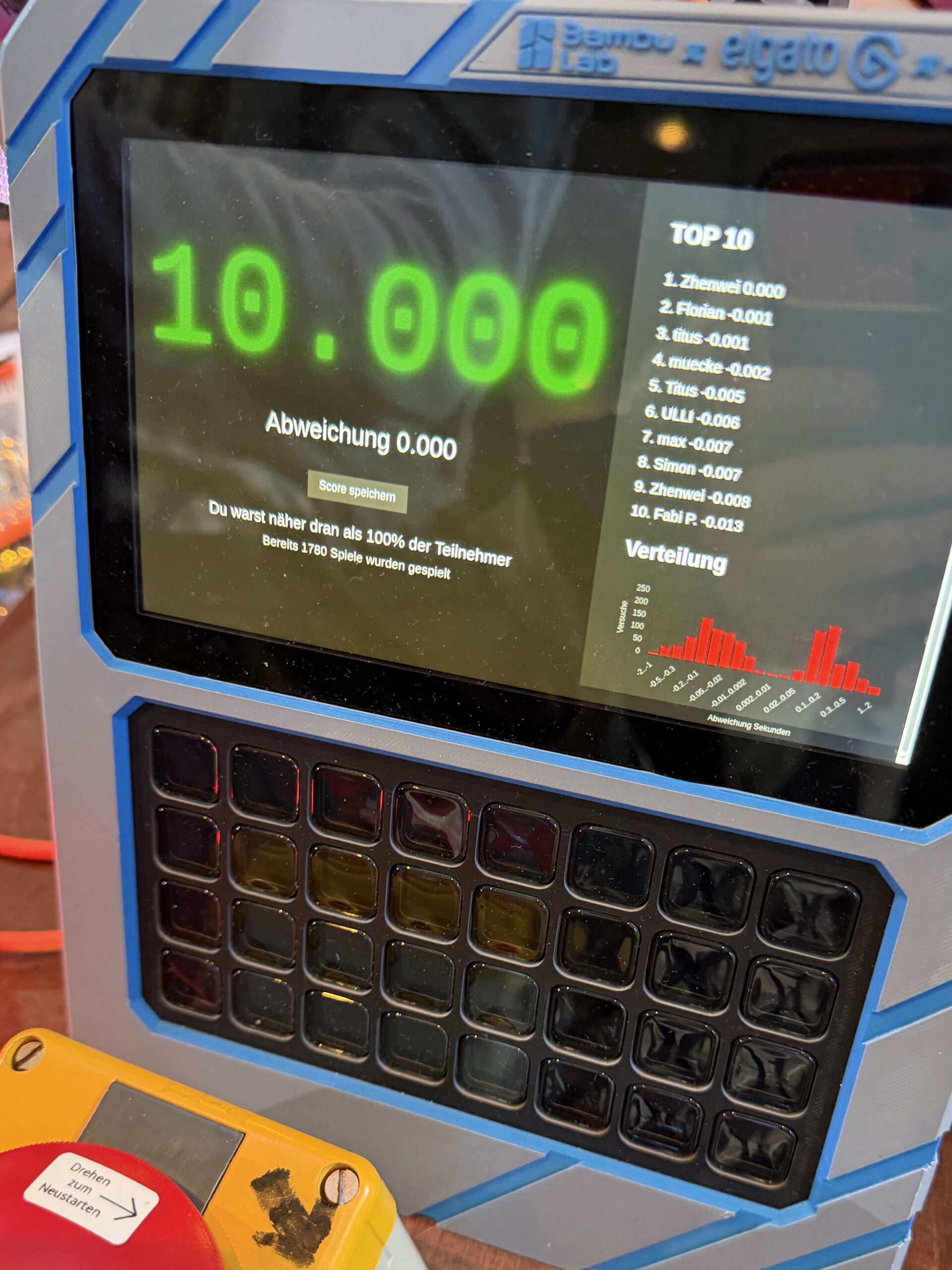 Drücke den großen Roten Knopf bei GENAU zehn Sekunden, wirkt nicht schwer oder? Naja, gehen wir davon aus das diese Zeit auf eine tausendstel Sekunde (0,001) getroffen werden muss klingt es doch nach einer Herausforderung. Etwa 2600 Runden wurden gespielt, viele sehr gute Treffer waren dabei und sogar ein Perfekter Treffer!